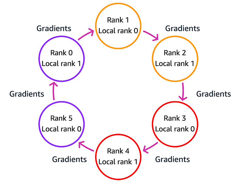 Illustration of ring allreduce with 6 processes on 3 machines with 2 GPUs each. rank is a global unique ID and local rank is a local unique ID for each GPU