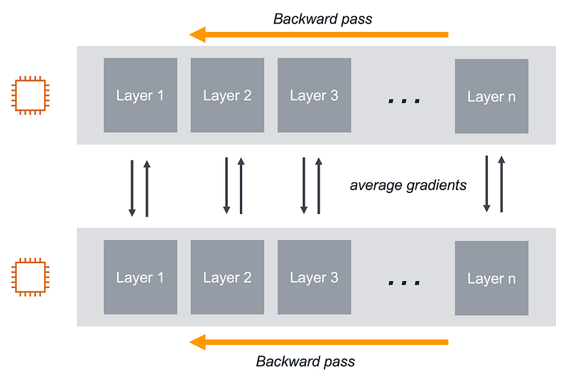 Step 1: During the forward pass, it’s business as usual. Each copy of the model does a forward pass with a batch_size of data that it receives.