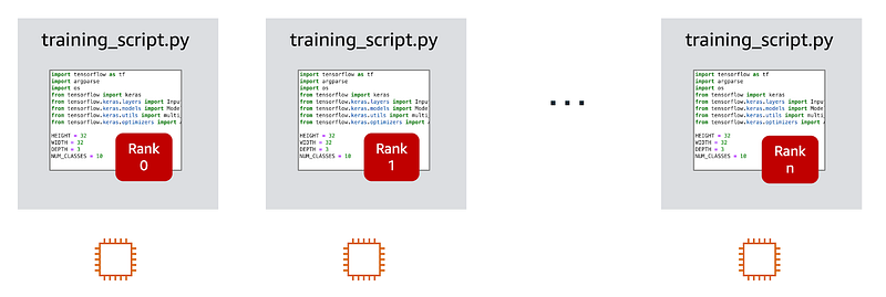 Illustration showing every GPU running the exact same copy of the training script. Each training process is uniquely identified by it’s rank