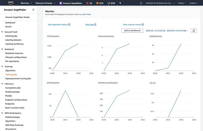 You’ll also find a link to Amazon CloudWatch dashboard where you can monitor training job logs for all instances. This comes in handy for debugging and diagnosing when something isn’t looking right.