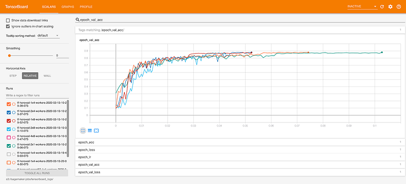 Live monitoring of distributed training progress of multiple models. Logs are saved in Amazon S3 which allows you to run tensorboard and monitor progress on any machine with access to your S3 bucket.