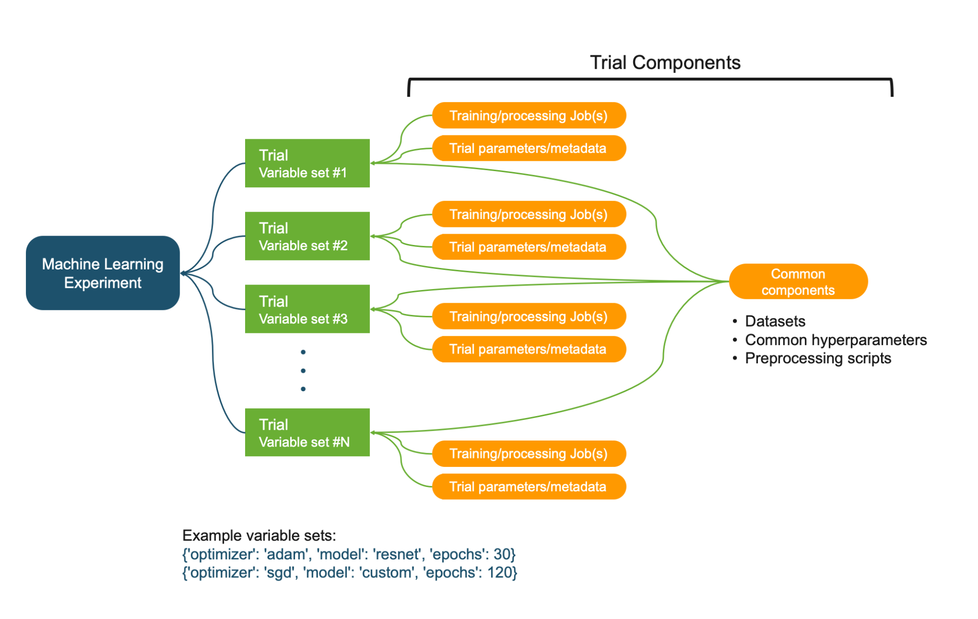 - A Trial component can be associated with multiple Trials. This is useful to track datasets, parameters and metadata that is common across all Trials in an Experiment.
