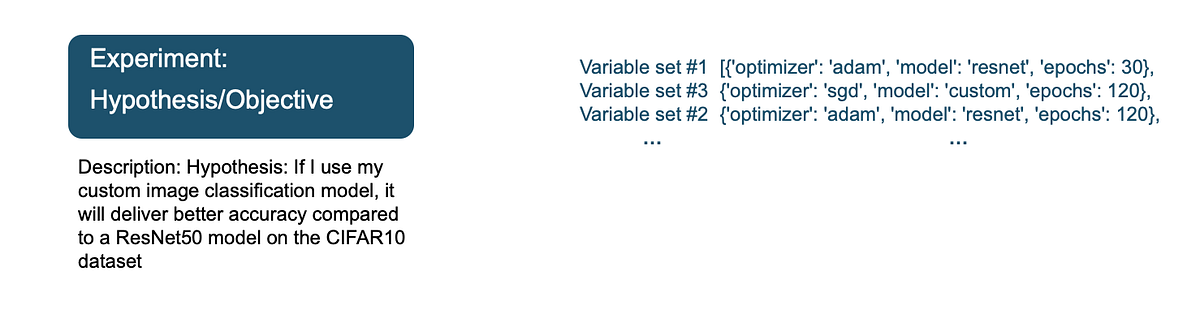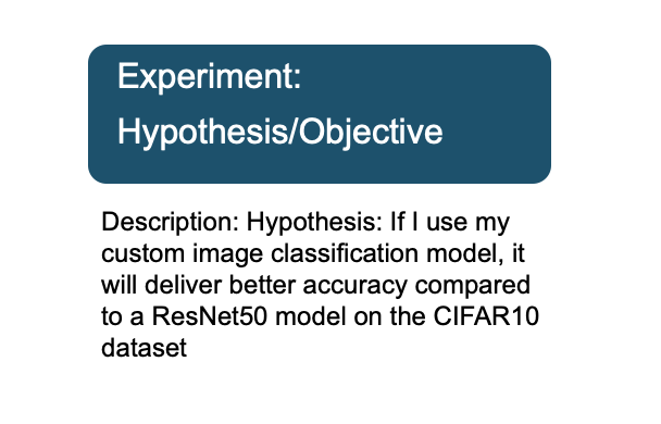 I can use this data to either accept or reject my hypothesis that my custom model delivers better accuracy than ResNet50 for the CIFAR10 dataset. I built this example to illustrate the key concepts of experiment management, and the above data may not be sufficient to draw any conclusions. In which case you can conduct another experiment by updating your hypothesis and variables.