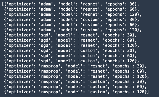 In our example, I want to test the efficacy of our custom neural network architecture, which I believe to be better than off-the-shelf ResNet50. Therefore model architecture is our first variable or controlled factor. I also want to study the effect of other hyperparameters on the response — optimizer (adam, sgd, rmsprop), epochs (high accuracy at fewer epochs). I can define these with the following code.