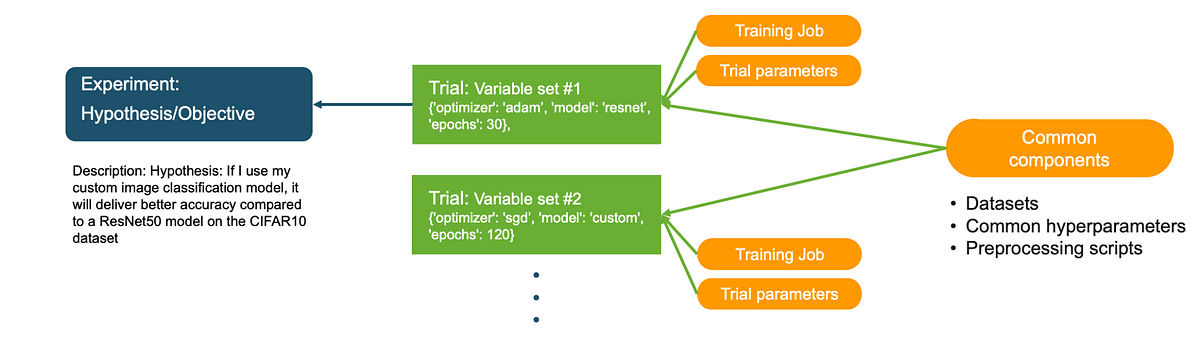 Let’s start off by introducing a few key concepts. I’ll keep coming back to these throughout the article, so this won’t be the last you’ll hear about them. By presenting these key concepts upfront I hope it will give you a better sense of the relationship between experiments, trials, trial components, jobs, artifacts, metrics and metadata as you go through the example.