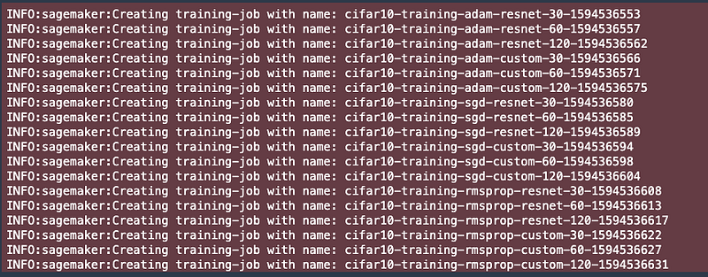 After you run the above code, you’ll see SageMaker spawn multiple training jobs, each associated with its unique Trial.