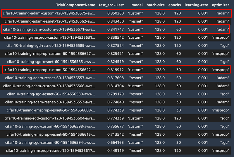 If you like to dive deep into each training job and analyze metrics, weights or gradient information, you can use SageMaker Debugger. SageMaker Debugger automatically captures some default debug information from every training job, and you can also customize what data should be emitted for later analysis. If you’re interested in debugging machine learning with SageMaker check out my earlier post that does a deep dive on debugging: