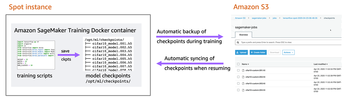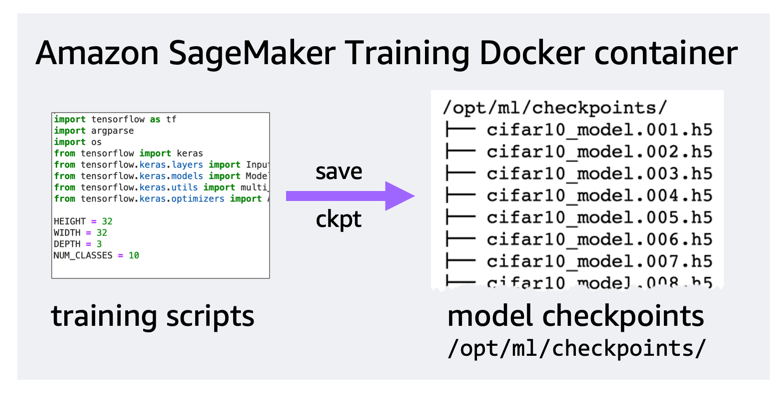 Amazon SageMaker will automatically back up and sync checkpoint files generated by your training script to Amazon S3. Therefore you’ll need to make sure that your training script saves checkpoints to a local checkpoint directory on the docker container that’s running the training. The default location to save the checkpoint files is /opt/ml/checkpoints and Amazon SageMaker will sync these files to the specific Amazon S3 bucket. Both local and Amazon S3 checkpoint locations are customizable.