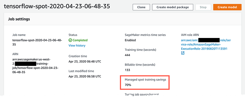 To monitor your training job and view savings you can look at the logs on your Jupyter notebook or navigate to Amazon SageMaker Console > Training Job, click on your training job name. Once the training is completed, you should see how much you saved. As an example, for a 30 epoch training on a p3.2xlarge GPU instance, I was able to save 70% on training cost!
