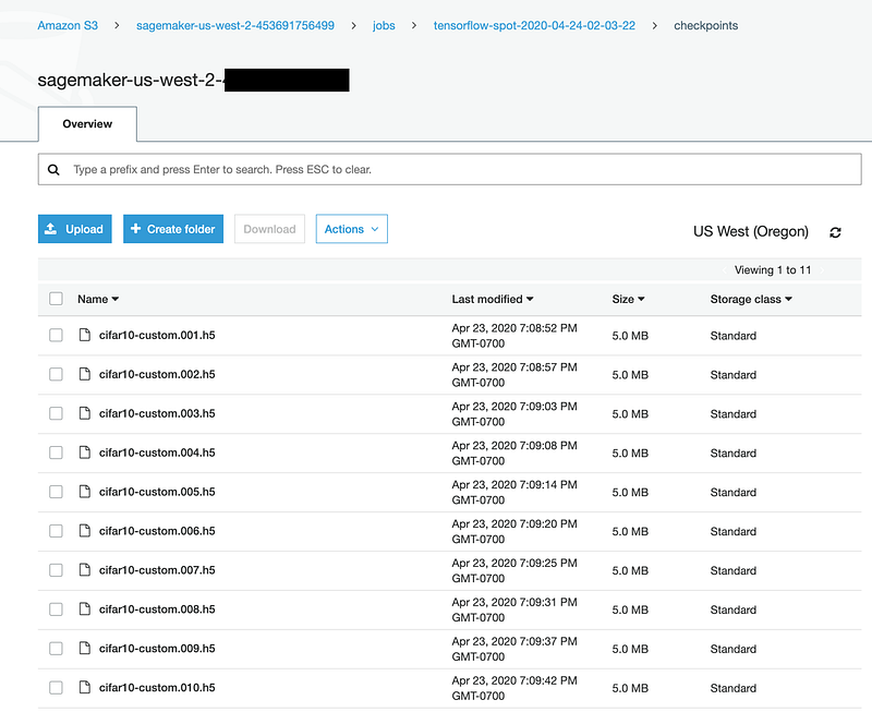 Fortunately, you can still test your code for its behavior when resuming training. To do that first run an Amazon SageMaker Managed Spot training for a specified number of epochs as described in the previous section. Let’s say you run training for 10 epochs. Amazon SageMaker would have backed up your checkpoint files to the specified Amazon S3 location for the 10 epochs. Head over to Amazon S3 to verify that the checkpoints are available: