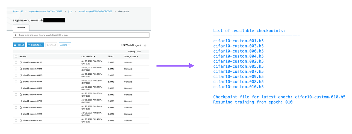 Spot instances can be preempted and be terminated with just 2 minutes notice, therefore it’s critical that you frequently checkpoint training progress. Thankfully, Amazon SageMaker will manage everything else. It’ll automatically backup your training checkpoints to Amazon S3 and if the training instance is terminated due to lack of capacity, it’ll keep polling for capacity, and automatically restart training once capacity becomes available.