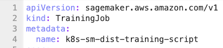 k8s-sm-dist-training-script.yaml a config file that when applied using kubectl kicks of a distributed training job. Open it in your favorite text editor to take a closer look.