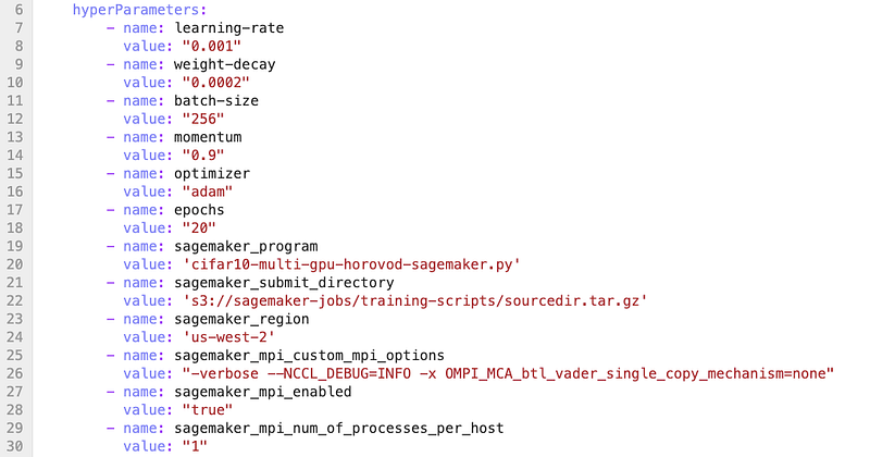 sagemaker_program— cifar10-multi-gpu-horovod-sagemaker.py TensorFlow training script that implements Horovod API for distributed trainingsagemaker_submit_directory— location on Amazon S3 where training scripts are locatedsagemaker_mpi_enabledandsagemaker_mpi_custom_mpi_options— enable MPI communication for distributed trainingsagemaker_mpi_num_of_processes_per_host— set to the number of GPUs on the requested instance. Forp3dn.24xlargeinstance with 8 GPUs set this value to 8.