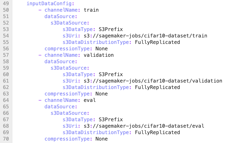 First you’ll notice that kind: TrainingJob. This suggests that you’ll submit an Amazon SageMaker training job.