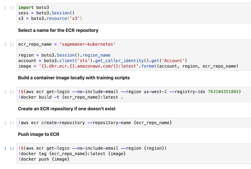 If you’re working with custom proprietary algorithms then you’ll have to build your own Docker containers. To submit a training job with a custom container you’ll have first build the container image locally and push it to Amazon Elastic Container Registry (ECR). After you push the image to ECR, you’ll update the Kubernetes job config file with your ECR path, rather than the TensorFlow container path we provided in the previous example.