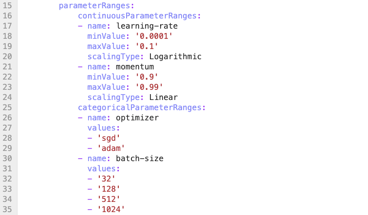 Hyperparameters can be integerParameterRanges, continuousParameterRanges or categoricalParameterRanges. In the above example optimizer and batch size are categorical which means Amazon SageMaker will randomly pick one of the specified values. For learning rate and momentum, Amazon SageMaker will randomly pick a continuous value in the specified range.