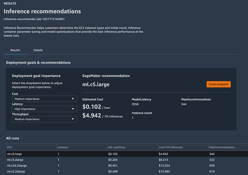 SageMaker supports over 60 instance types and counting, and selecting the right one to meet your deployment goals can be time consuming. You can use SageMaker Inference Recommender to run a default recommendation job or specify a custom performance benchmark on a selected set of instances to simulate performance for your production deployments. You likely have a target throughput, latency and you can specify those along with a sample payload to run tests on. This process typically takes a couple of hours or longer depending on the model and custom options, and the results can be viewed in SageMaker Studio or analyzed in Studio notebook using popular libraries like Pandas.