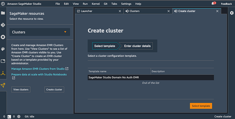 A typical setup is to use AWS Service Catalog to define and roll out preconfigured templates that allow SageMaker Studio users to create EMR clusters right from Studio. After this initial setup process typically performed by your DevOps administrator, or a highly talented data scientist, your Studio environment is ready to create EMR clusters, connect to it, monitor and debug Spark jobs using Spark UI. To run Spark jobs you can use Sparkmagic which allows you to run Spark code within Jupyter Notebook against the remote EMR cluster that you created within Studio. Sparkmagic also creates an automatic SparkContext and HiveContext.