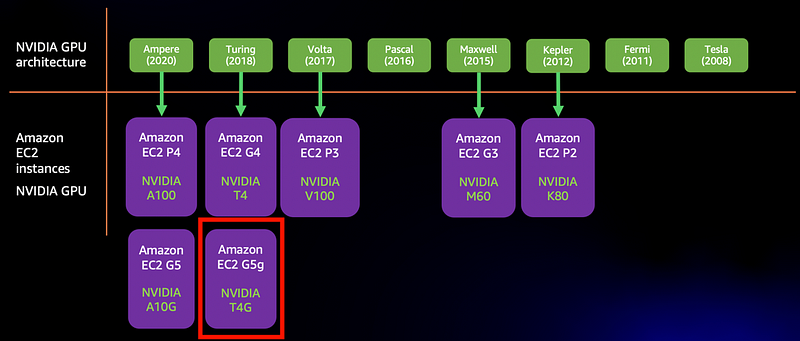 EC2 G5g instance is a cost effective option for machine learning inference deployments making it an alternative to EC2 G4 and EC2 G5 which are based on Intel CPUs. NVIDIA offers Deep Learning Amazon Machine Image on AWS Marketplace which comes preconfigured with all the necessary NVIDIA drivers, libraries, and dependencies to run Arm-enabled software on EC2 G5g.