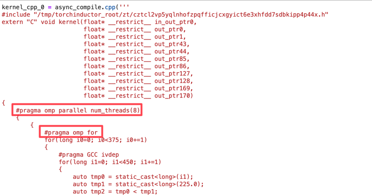 You can compile PyTorch functions using torch.compile() and TorchInductor will optimize and generate C++ code with OpenMP pragmas for parallization. This will significantly improve the performance of the function. All of this happens under the hood when you run the code below, but you can pass an additional argument options={'trace.enabled':True} to see the generated code. I discuss this is further detail in my PyTorch 2.0 blog post:
