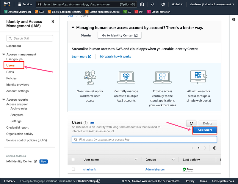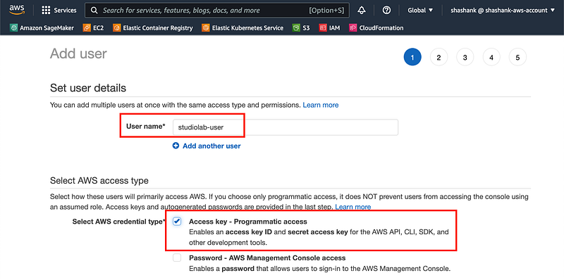 On your brand new AWS account, my you to first create an IAM user. An IAM user is an entity you create within your AWS account that you use to access AWS services. If you’re the sole user of the AWS account and want unrestricted access to all AWS services, then you can be a user with Administrator privileges. How AWS best practices recommend that you always apply least-privilege permissions to users and roles (we’ll come to roles in a bit). Let’s create an IAM user with credentials to programmatically access Amazon SageMaker services from Studio Lab.