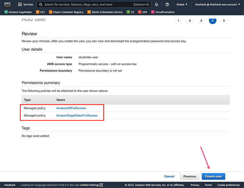 You can either give this user Administrator access or click on “Attach existing policies directly” and give specific service permissions. Let’s choose the latter options and choose “AmazonSageMakerFullAccess” and “AmazonS3FullAccess” as the specific services we can access from Studio Lab. If you are the sole user you can choose to give yourself administrator access which will allow you to access any AWS service from Studio Lab. Click “Next” twice to skip tags. Click Create user