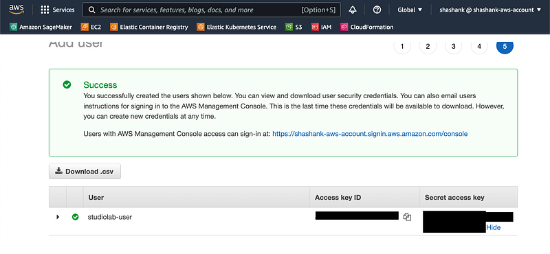 IMPORTANT: Copy the Access key ID and Secret access key and store it safely. You’ll need it to access SageMaker from Studio Lab. You won’t have access to the secret later if you forget to copy it now!