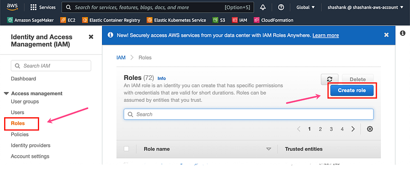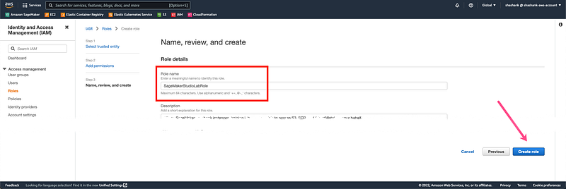 Give the role a name (e.g. SageMakerStudioLabRole) in the text field under Role name and select Create role.