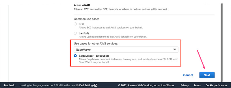 Under “Use cases for other AWS services” select SageMaker and click Next
