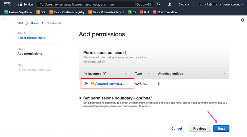 The IAM managed policy, AmazonSageMakerFullAccess is automatically attached to this role. Click Next