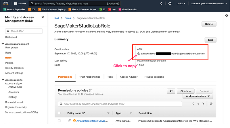 On the Roles section search for the role you just created “SageMakerStudioLabRole” and click on it. Copy the role ARN, we’ll need to provide this to SageMaker SDK when using it from Studio Lab.