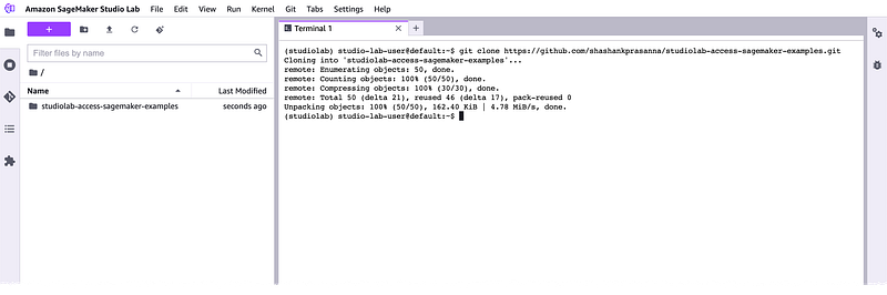 Let’s test your setup with an example. In your Studio Lab terminal, run the following to clone an example repository in to the home directory: