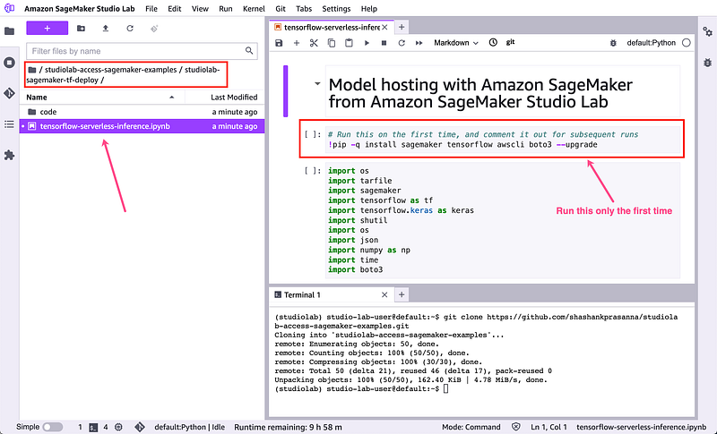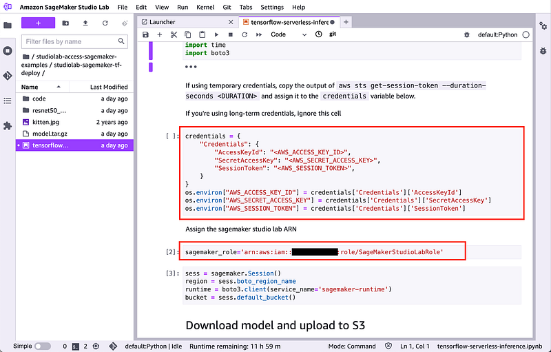 In Studio Lab navigate to studiolab-sagemaker-examples > studiolab-sagemaker-tf-deploy and open Notebook tensorflow-serverless-inference.ipynb