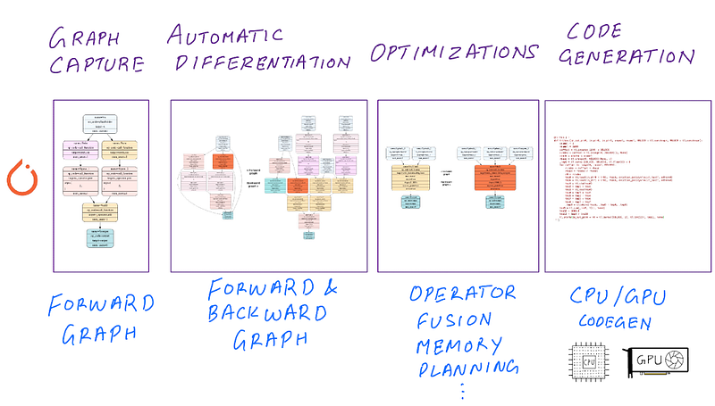 All we did was add a single line of extra code torch.compile() to invoke our compiler. Let’s now take a look at what’s happening under the hood at each stage.