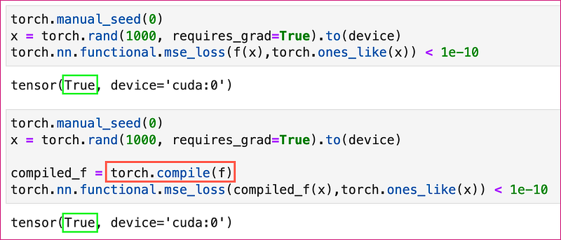 Now, it’s time to call torch.compile() . First let’s convince ourselves that compiling this function doesn’t change its output. For the same 1x1000 random vector the mean squared error between the output of our function and a vector of 1s should be zero for both the compiled and the uncompiled function (under some error tolerance).