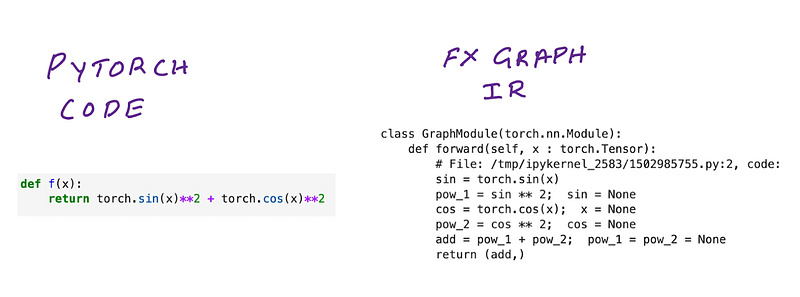 It’s important to note that Torch FX graphs are just containers for IR and don’t really specify what operators it should hold. In the next section we’ll see the FX graph container come up again with a different set of IRs. If you compare the function code and FX IR there’s very little difference between the two. In fact, it’s the same PyTorch code you wrote, but laid out in a format that the FX graph data structure expects. They both will provide the same result when executed.