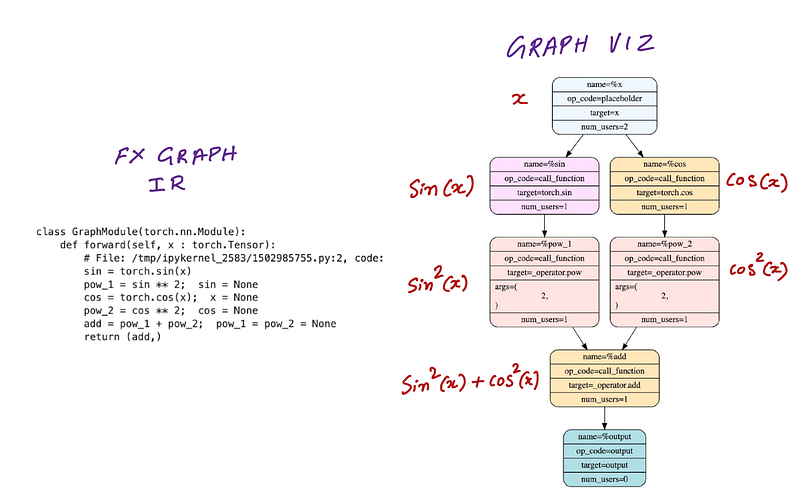 The output of that above code snippet are the FX IR code and the graph diagram showing our function sin^2(x)+cos^2(x)