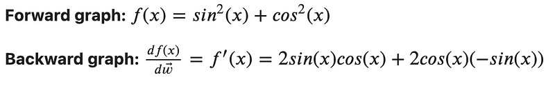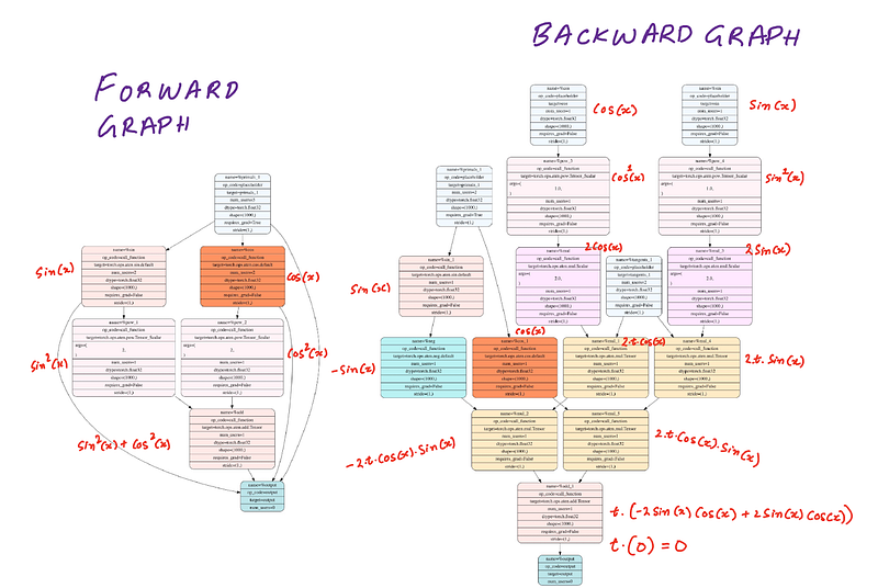 First let’s calculate what we expect the backward pass graph should look like and then compare it with what PyTorch generates. For our simple function, the forward graph and the backward graph should implement the following function. If sin and cos bother you, you can imagine f(x) being the loss function applied to a neural network.