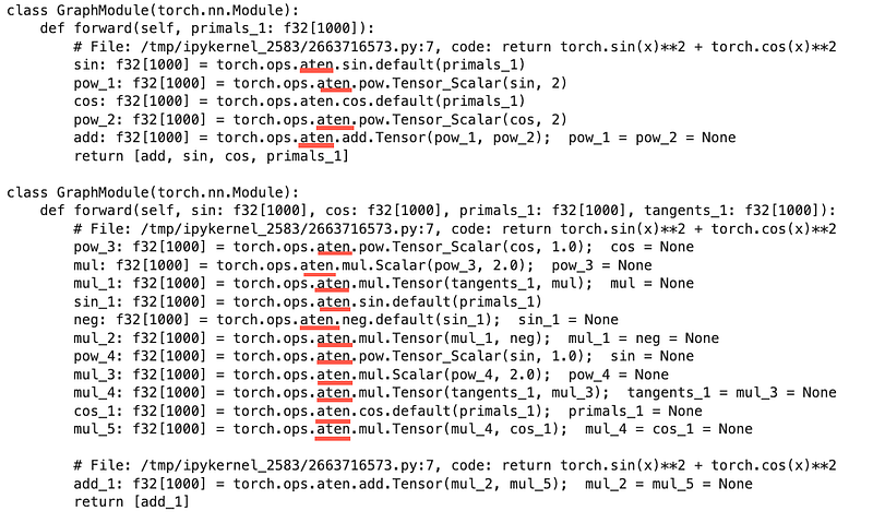 In eager mode operation, your PyTorch operations are routed to this library which then calls the appropriate CPU or GPU implementation. AOTAutograd automatically generates code that replaces the higher level PyTorch API with ATen IR for the forward and backward graph which you can see in the output below:
