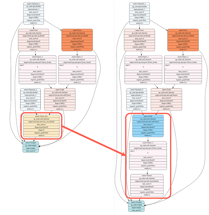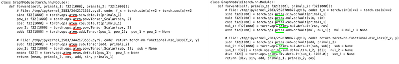 Now let’s decompose it further into Prims IR which is a much smaller subset of ~250 operators. Again, I’ll only share the relevant code snippet and output here since you can find the full notebook on GitHub.