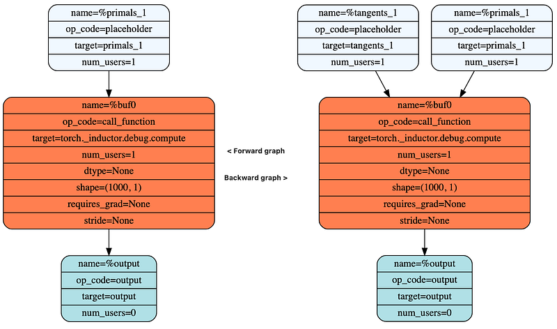 PyTorch uses reverse-mode automatic differentiation to compute the gradients, and PyTorch’s implementation of automation differentiation is called Autograd. PyTorch 2.0 introduces AOTAutograd which traces the forward and backward graph ahead of time, i.e. prior to execution, and generates a joint forward and backward graph. It then partitions the forward and the backward graph into two separate graphs. Both the forward and the backward graphs are stored in the FX graph data structure and can be visualized as shown below.