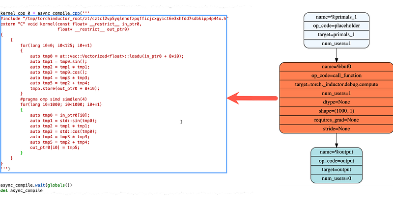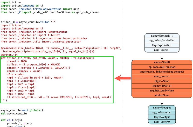 You must surely be wondering what this fused operator looks like in code. The code for the fused operator is automatically generated by TorchInductor and it’s in C++ or Triton based on the target device — CPU or GPU. You don’t need to explicitly specify to TorchInductor which device to target, it can infer it from the data and model device type.