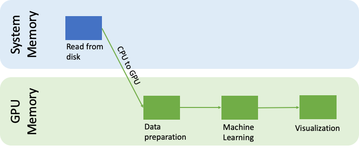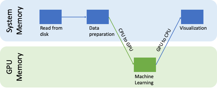 To use these libraries, you’ll need to load the dataset into system memory, pre-process your dataset using popular packages such as Pandas, and convert it into a format that the machine learning algorithm can use. The prepared dataset is now copied into GPU memory and after training is done, results are copied back to system memory for post-processing and visualization. One downside of this approach is that moving dataset in and out of a GPU can affect overall processing times.