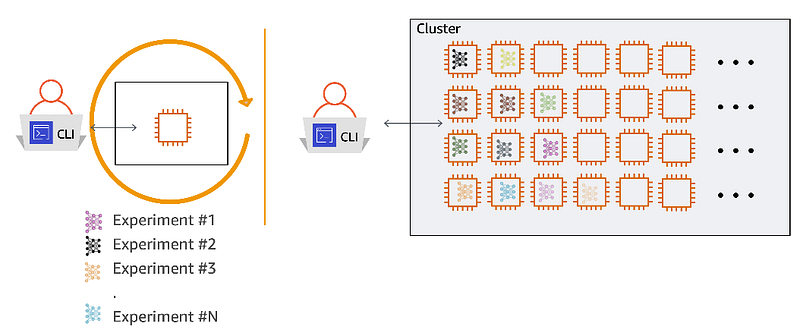 Running experiments sequentially on a single machine vs. running them in parallel on a cluster.