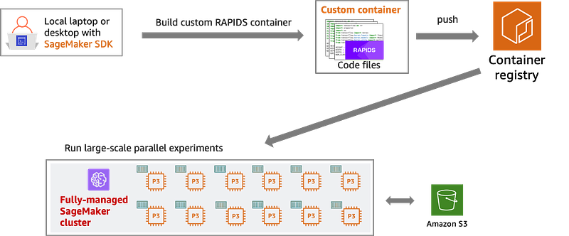 End-to-end workflow: (1) Start with a RAPIDS training script (2) Build an Amazon SageMaker compatible Docker container (3) Push it to a container registry (4) Initiate hyperparameter search experiment on a Amazon SageMaker cluster