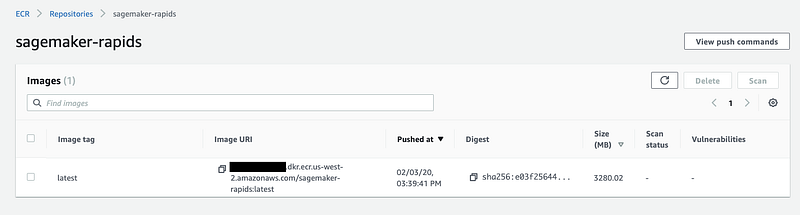 Navigate to the AWS Console > Amazon ECR > sagemaker-rapids and you should see your freshly pushed container in this registry.