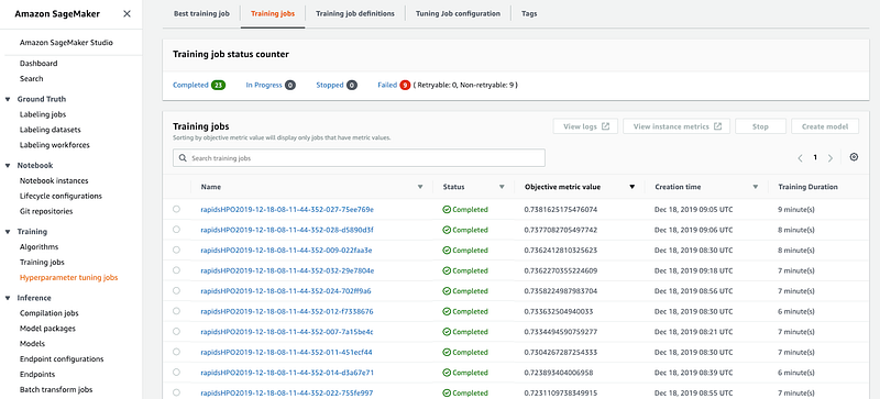 Click on Training Jobs tab and you’ll see all the jobs that were run for different hyperparameter combinations.