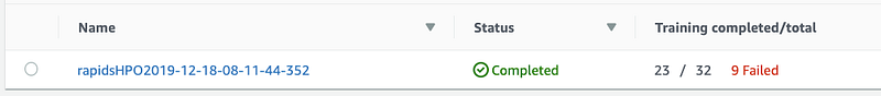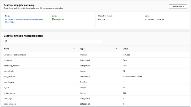 “Best” here doesn’t mean best for the dataset. It’s the best of the 32 jobs that ran, with hyperparameters sampled from the ranges I specified, and for the validation set I chose. It basically means there’s always room for improvement. When I ran this example 9 of the 32 jobs failed, since bayesian optimization selected hyperparameter values from the range I specified, which happened to be over or under the limit of what the cuML RandomForest implementation could accept. If you see this, update the ranges to be more conservative, and always consult the documentation on what values are acceptable for each hyperparameter.